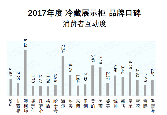 消費者互動度方面,澳柯瑪遙遙領(lǐng)先。報告指出,和一般的消費者不同,冷藏展示柜的消費者多是商超賣家、餐飲服務(wù)者、糕點店主等。冷藏柜消費者與冷藏柜品牌互動也主要體現(xiàn)在售前售后服務(wù)方面。澳柯瑪專業(yè)做冷柜,單看其銷量連續(xù)近20年保持行業(yè)第一,便可以知道其冷藏柜消費者的群體有多大,品牌效應(yīng)使得冷藏柜市場消費者互動最多的品牌是澳柯瑪。