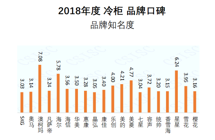 品牌知名度:澳柯瑪、星星、海爾在品牌知名度中位居前三。澳柯瑪、星星、海爾、美菱、美的、容聲、海信、華美在近兩期中表現(xiàn)穩(wěn)定,品牌知名度位居前十。