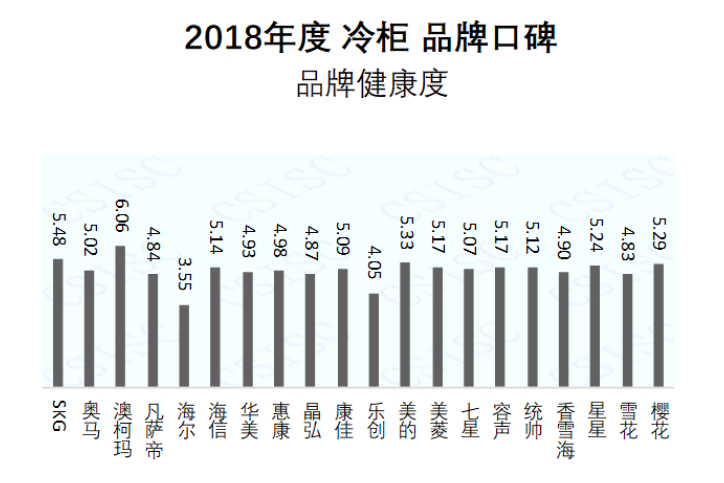 本期研究結(jié)果顯示, 2018年度冷柜品牌口碑的十佳品牌有澳柯瑪、海爾、星星、美的、美菱、容聲、海信、康佳、櫻花、雪花。TOP10品牌的指數(shù)構(gòu)成中,多數(shù)品牌在六個(gè)維度方面的分布比例比較均衡;產(chǎn)品好評(píng)度所占比例最高,企業(yè)美譽(yù)度所占比例最低;質(zhì)量認(rèn)可度差異較大,產(chǎn)品好評(píng)度差異較小。自左向右橫向來看,質(zhì)量認(rèn)可度遞減,產(chǎn)品好評(píng)度遞增,品牌健康度遞增。