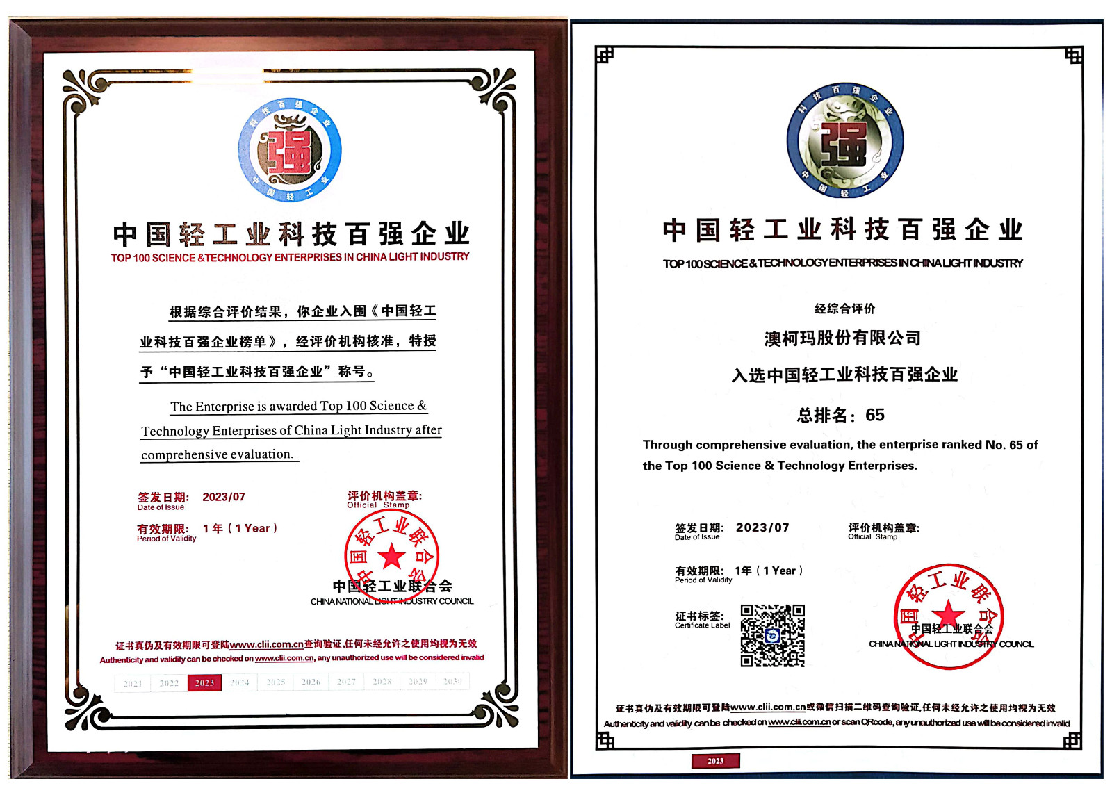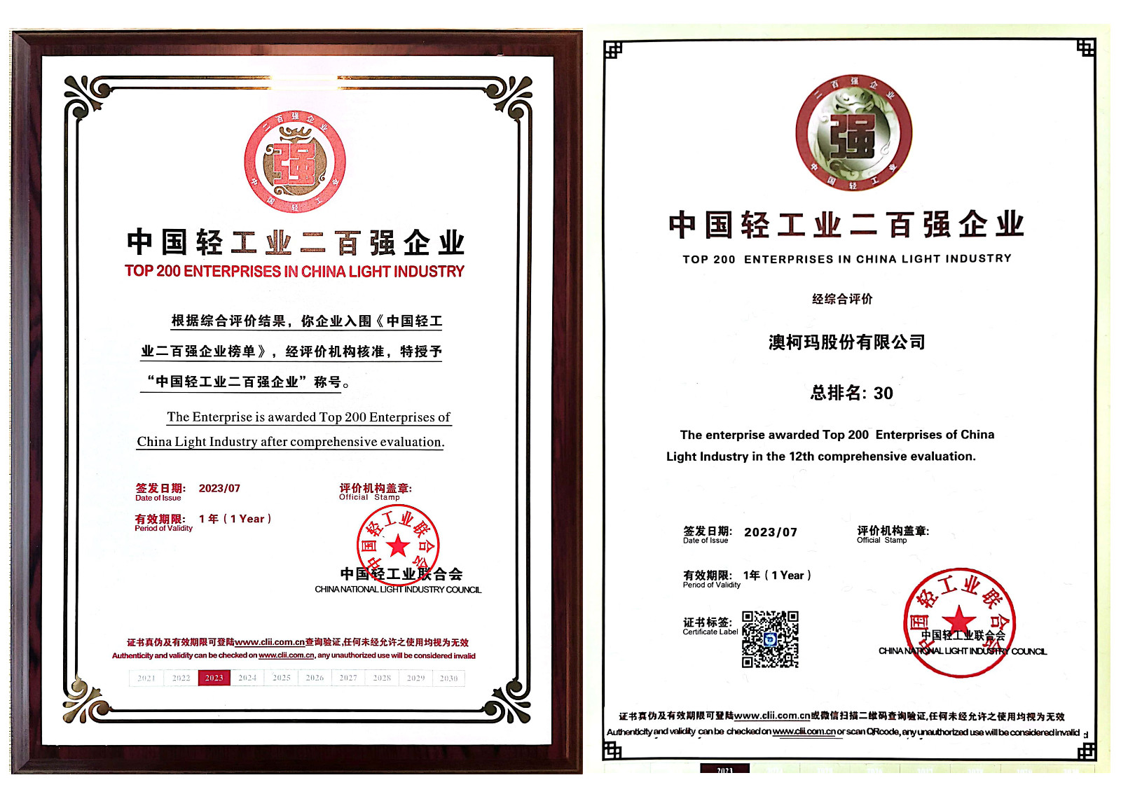 澳柯瑪連續(xù)十二年入選中國(guó)輕工業(yè)二百?gòu)?qiáng)企業(yè)
