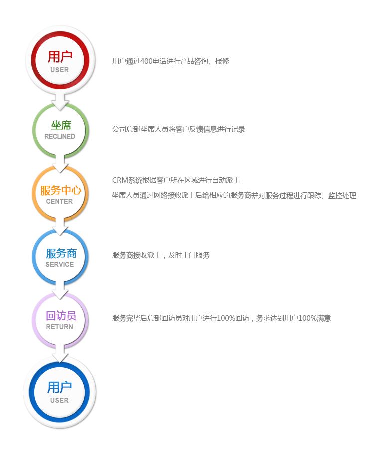 以用戶為中心,以公司總部、服務(wù)中心、服務(wù)商、回訪員為服務(wù)流程的貼心服務(wù)。